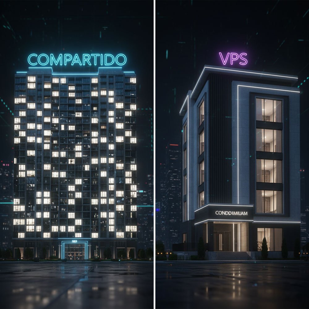 Cómo funciona: Alquilas un apartamento en un edificio grande (un servidor) donde viven muchos otros sitios web. Todos comparten los recursos (luz, agua, ascensor… o sea, CPU y RAM).